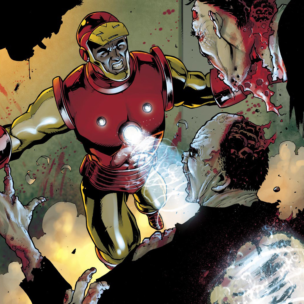 una botella de licor de su caja fuerte. Rodey se pregunta que tiene que ver ese licor con todo eso a lo que Stark le responde que diseño pequeños microbots que comian la carne muerta, varios empleados infectados, incluyendo a Pepper invaden la oficina, Tony se sacrifica haciendo que lo devoren mientras se toma los microbots, estos logran detener a los zombies. Rodey pide ayuda a las autoridades nombrándose como el nuevo Iron Man.